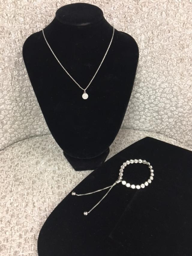 Perfect for that night out on the town, or with a graphic tee and jean jacket, Bestie is a small jeweled piece on a silver chain and screams “simple elegance.” The dainty bracelet, At Last, with matching jewels, has an easy slide for perfect sizing on any wrist and also for easy wear.