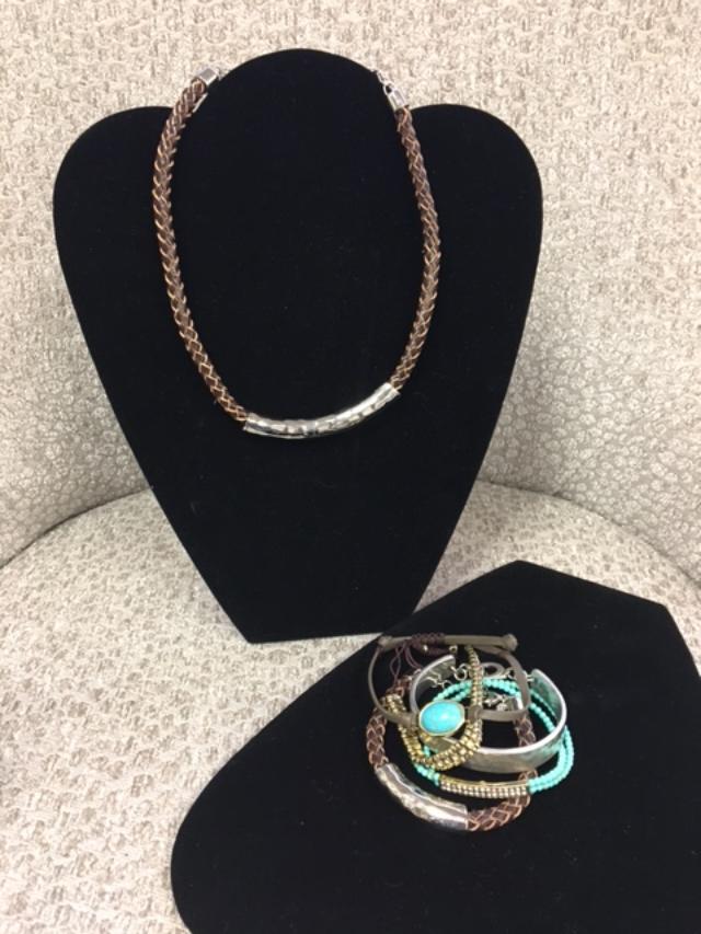 This necklace bracelet set, named Organic, is the perfect all around combination. The corded brown leather necklace is accented with the silver slide and has a matching bracelet. Paired up with the BFF bracelet set, you have three bracelets that can be worn together or apart. One is brass with an easy slide on cording. The other two are accented with turquoise beads and brown leather. A third bracelet to round out the set, is the Inner Strength bracelet. The finish is silver with a pounded metal look, but the real fun is what is engraved inside this cuff bracelet…"She believed she could, so she did." Any of these items alone or together work as a wonderful ensemble.