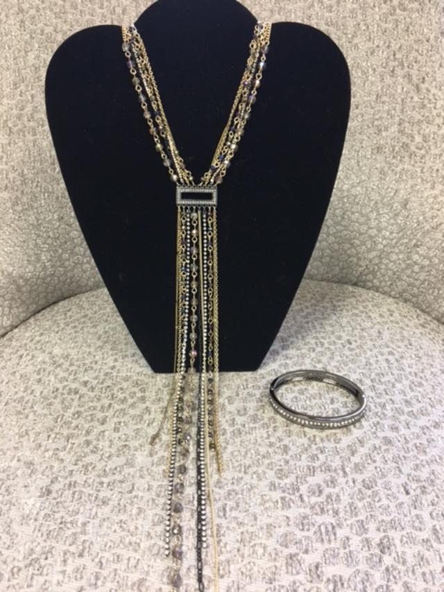 This statement necklace stands alone with lots of metal tones and sparkle. Modern Muse is a great selection giving you a natural “Y” shape with your jewelry piece, meaning a more slimming look to your outfit. Placed together with the Striking bracelet, you have an elegant pair. Striking is an easy clip on bracelet in the hematite metal tone with jewels channeled in on one side of the bracelet.