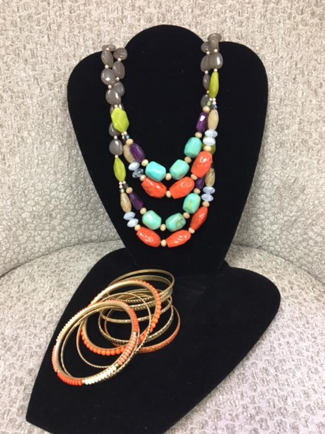 If you’re ready for spring break, or just want a pop of color in your wardrobe, than the Spring Break Necklace is just what you need. Spring Break is two stands that can be worn together, or taken apart for a less chunky look. Each strand has two strands connected, thus giving you the look of four strands when layered together. An easy necklace to buy and share with a friend if you are looking for the less chunky look, while loving the color. The on trend colors of turquoise, coral and lime green make it great for any t-shirt and jean combination. Paired with the Crush bracelet set, you have the perfect vacay look. Crush comes with bangles in both the coral color and gold tones. Separate or wear as a major arm party.