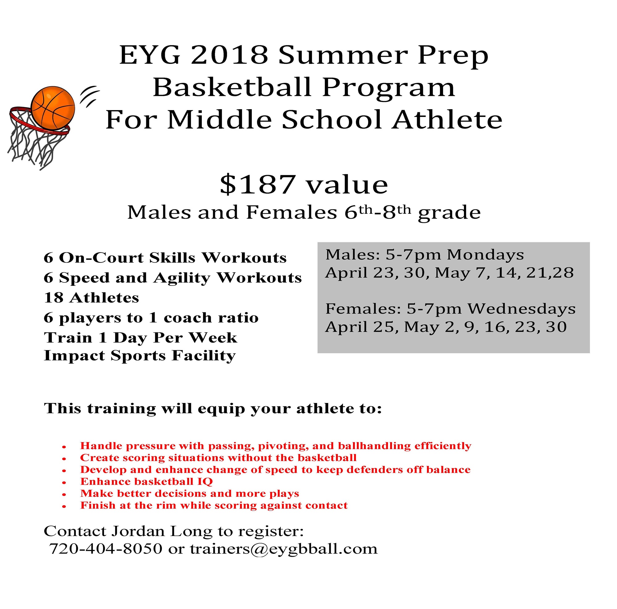 The Summer Prep Program is a 6 week, comprehensive skills training program that will take dedicated and motivated players through a detailed skills curriculum to prepare them for their next basketball opportunity. This program is for students grades 6th-8th, male or female. At EYG Basketball, we believe people can positively impact their basketball teams through dedicated and consistent training. Elevate your game, elevate your mind, and elevate your impact. When you attend Summer Prep Program you will be pushed, gain on-court skills, and leave with the confidence to better help your team. Our skills training process has lead athletes to discover a new level of skills and confidence. On top of it all, you will be surrounded with like-minded athletes who want to play differently; who want to be prepared! The Summer Prep Program only happens once a year, so don't miss your chance to join our community of dedicated players looking to be prepared for their next basketball situation. See Flyer for complete details.