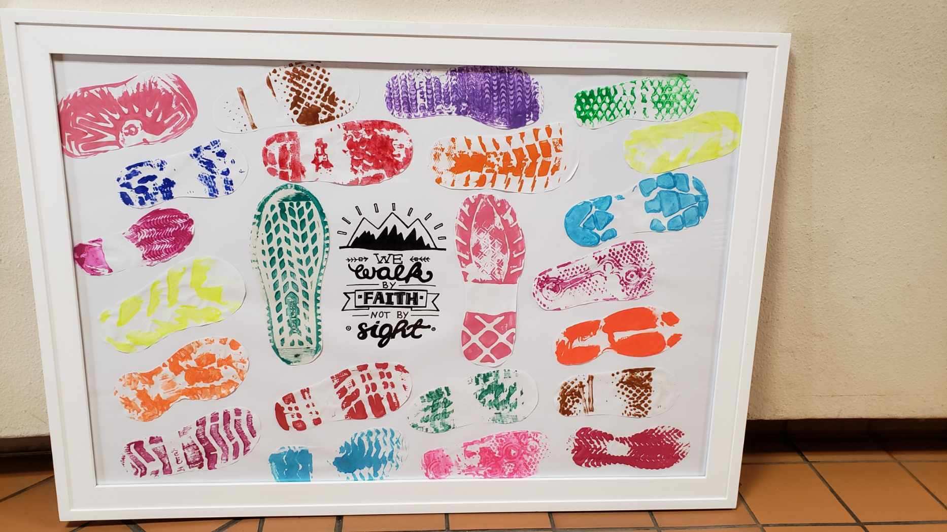 For this piece, students were delighted to paint AND print the sole of their shoe. It was a very messy process, but extremely powerful. We discussed the difference between a sole of a shoe and an eternal soul given by God. These tiny footprints were made as a reminder to them and to you; it’s great to talk with God,but our true goal is to actually WALK with Him. Walking with God means we not only ask Him to watch over us, but truly asking Him into our hearts. When we do this, it means we not only love Him, but want to be like Him. We ask Him to teach us to love as He loves, walk as He walks, and see as He sees. While it may not always be the easiest path, if we put our trust in Him, it will be the right one. We pray to always have the faith to choose God’s incredible, eternal love as our source of hope, truth, and life. Frame measures 40.5" x 28".