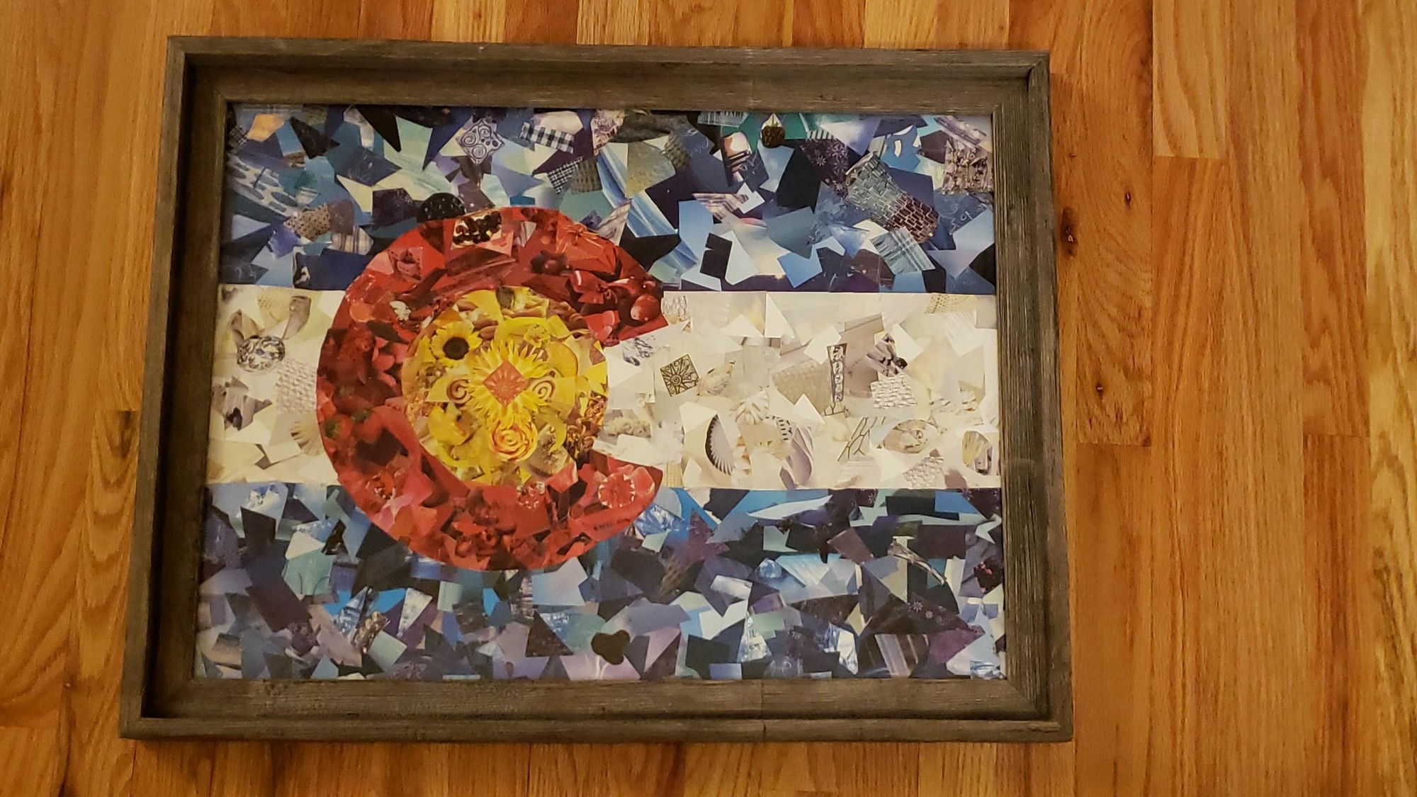 Faith’s 3rd graders have been learning about analogous and monochromatic color combinations. The simple blessing of color is one of God’s greatest gifts. Just as He breathes life into us, He can also help us breathe life into our art through color. Students working on this piece focused on tapping into the creative Holy Spirit God has given each of us. Children used their “artistic eyes” to choose, cut, splice, and paste pictures, textures, and designs from magazines to create this colorful, collaborative Colorado flag. As they added each tiny piece, students were reminded of the magnitude of God’s creativity. He created every single image we cut! The sheer number of lines, colors, textures, shapes, dimension, and beings….It’s mind blowing! The coolest part is that He invites us to use His amazing creations for His glory. As you look at this piece, let it remind you of all the amazing things God has created just for us. Thank Him for the tender loving care He took to make our world a beautiful place. If you look closely, you will find many hidden gems (both literally and figuratively) hiding within this piece; images of fruits, mountains, animals, clouds, bodies of water, flowers and many more. What do you see? Frame measures 27.5" x 21".
