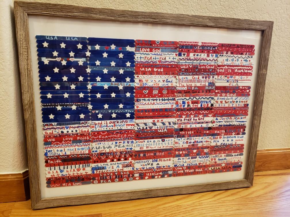 To create the piece, students used red, white, and blue acrylic paint to add color to popsicle sticks. Once dry, students used lines, shapes, patterns, and words to design and decorate several individual sticks. The most powerful part was to see the looks on their faces as we worked to piece it together. When we work together, as a team, beautiful things can be accomplished. While we worked, students were reminded how incredibly blessed we are to live in a country that has the freedom to choose and praise God’s amazing love and grace. If we trust in Him as our nation’s eternal leader, we cannot fail. Frame measures 26" x 20".