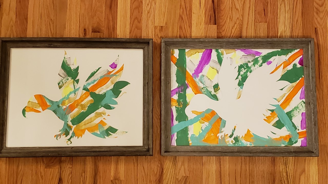 This collaborative piece was created by students choosing a favorite color of acrylic paint and using a large brush to stroke the paint in a variety of directions across the page. As each color was added, Mrs. Bundick's students were able to see how the page changed and became even more interesting, unique, diverse, and colorful. Students then chose a silhouette of a flying eagle to remind us of the Isaiah 40:31 - “But those who hope in the Lord will renew their strength. They will soar on wings like eagles; they will run and not grow weary, they will walk and not be faint.” Let these paintings be a reminder that you can do anything with God.