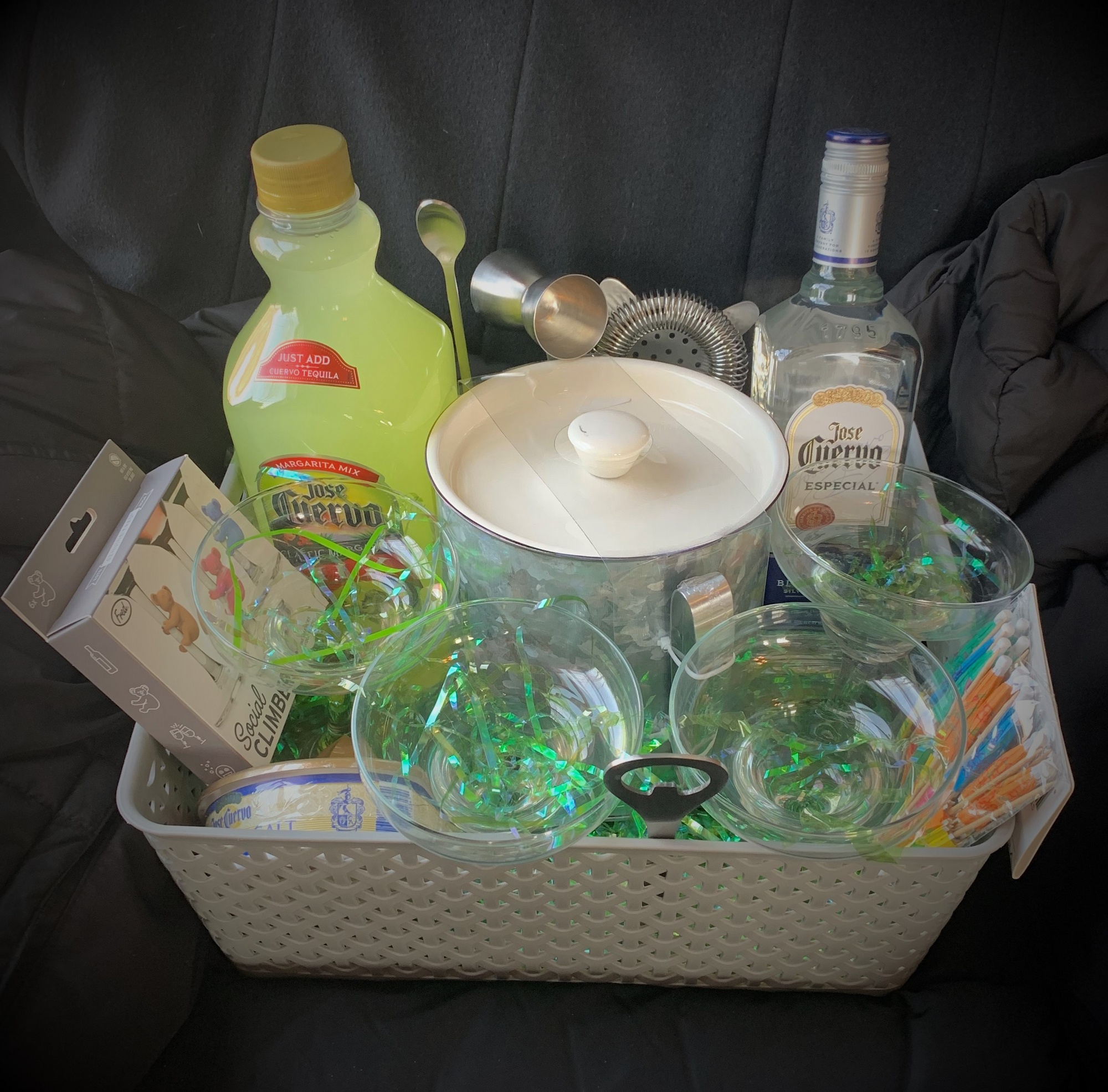 Margarita Madness: If you are a fan of margaritas, this basket is for you! Mix your own margs using the Cuervo silver tequila, margarita mix, and cocktail accessories! Serve your drinks in the included margarita glasses!