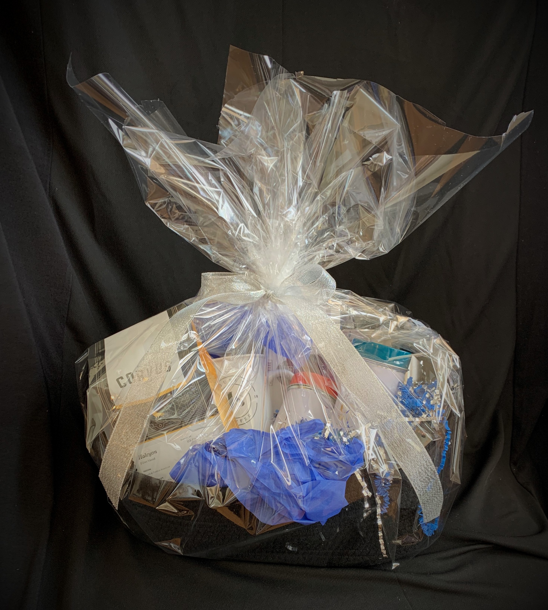 House of J's delicious goodie basket filled with coffee and tea! 1 tin of early grey loose leaf tea, 1 tin of blood orange smoothe tea, 1 loose leaf tea steeper, 1 house of J's ceramic mug, 1 insulated stainless steel travel mug with lid, 1 bag of Corvus Halcyon coffee, plus a $20 House of J's coffee gift card all in a black braided basket.