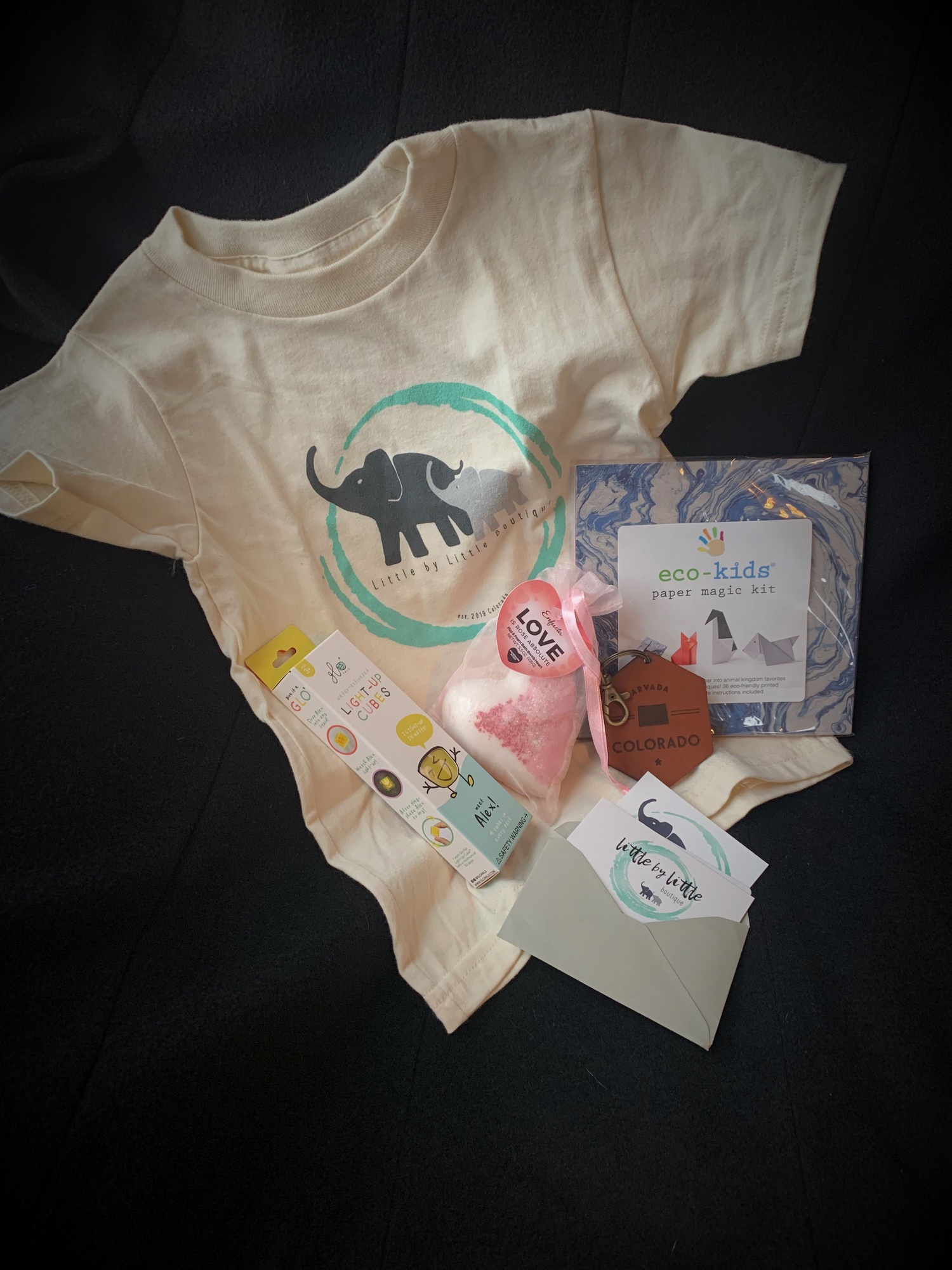 A little of this and a little of that! This Little by Little Boutique gift bag has a $25 gift card, GloPal pack water activated glowing ice cubes, Eco kids paper magic kit, Arvada key chain, bath bomb, and a size 2T Little by Little t-shirt.