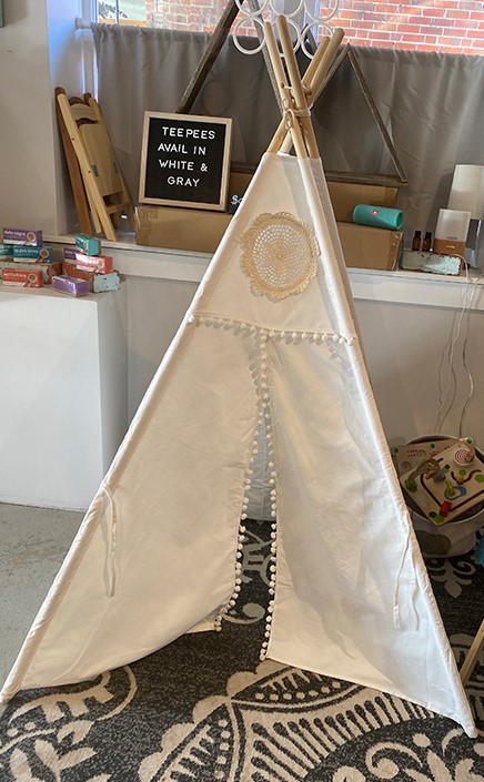 This little hideout is sure to please your sweet kiddo! A white tent with beautiful fringe, an oversized pillow, a lush pink throw, and a book for your little one's hideout.